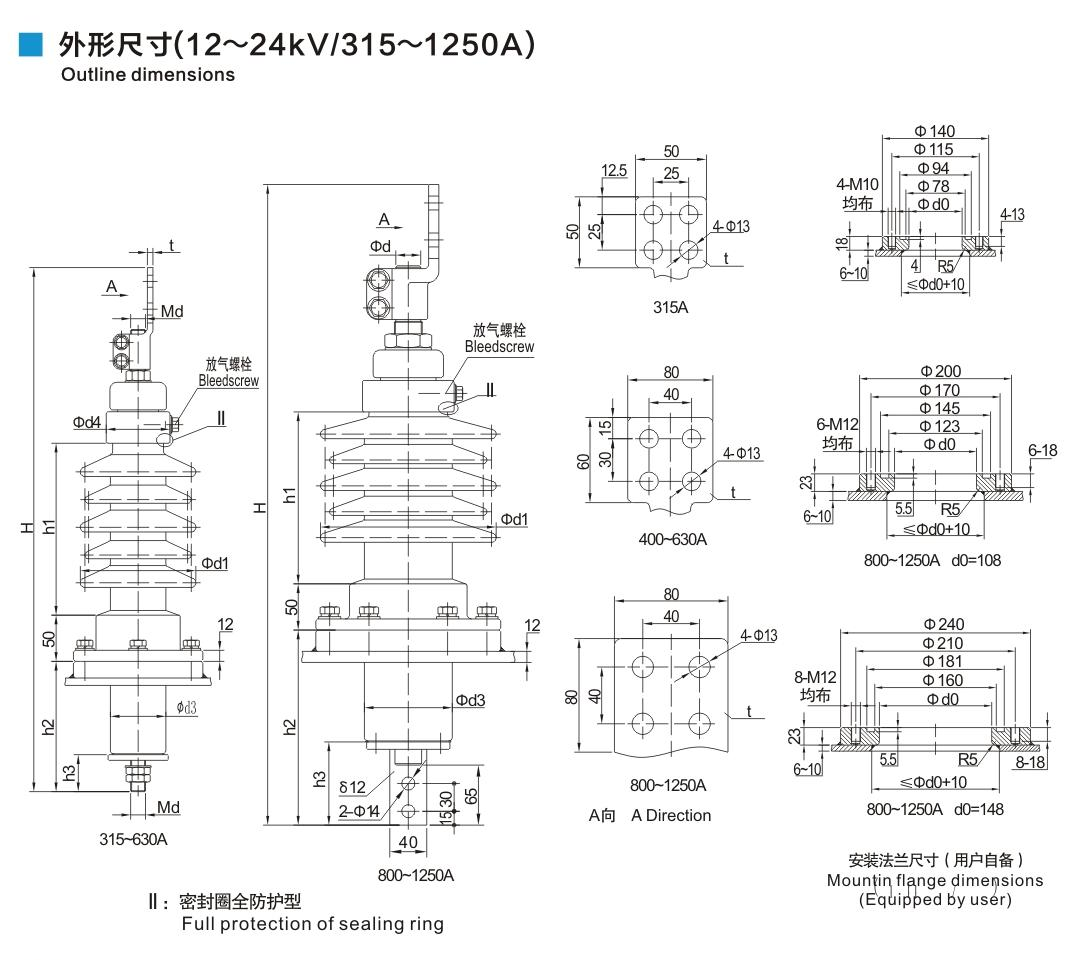 鋁法蘭瓷套管12~24kV/315~1250A穿桿式套管