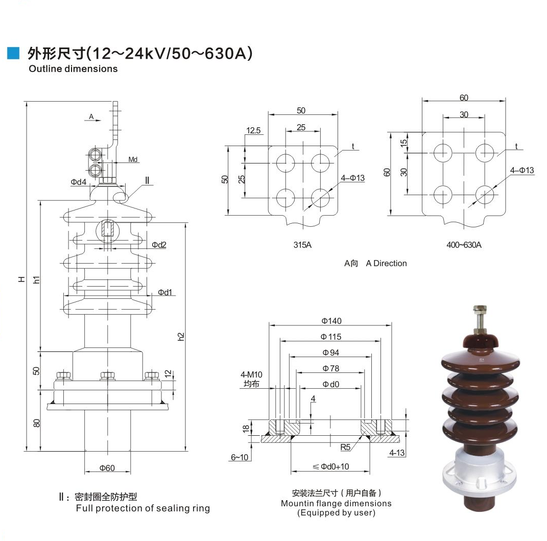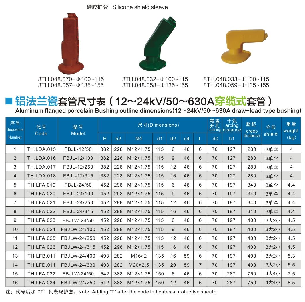 鋁法蘭瓷套管12~24kV/50~630A穿纜式套管